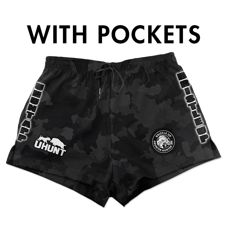 FOOTY SHORTS WITH POCKETS – Black Camo #006