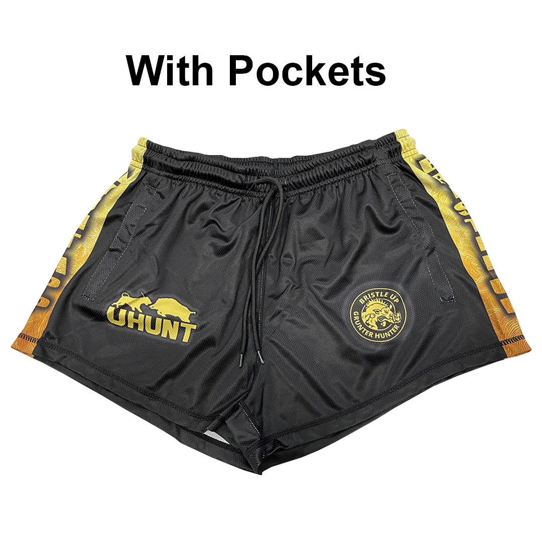 FOOTY SHORTS WITH POCKETS – Black & Gold #007