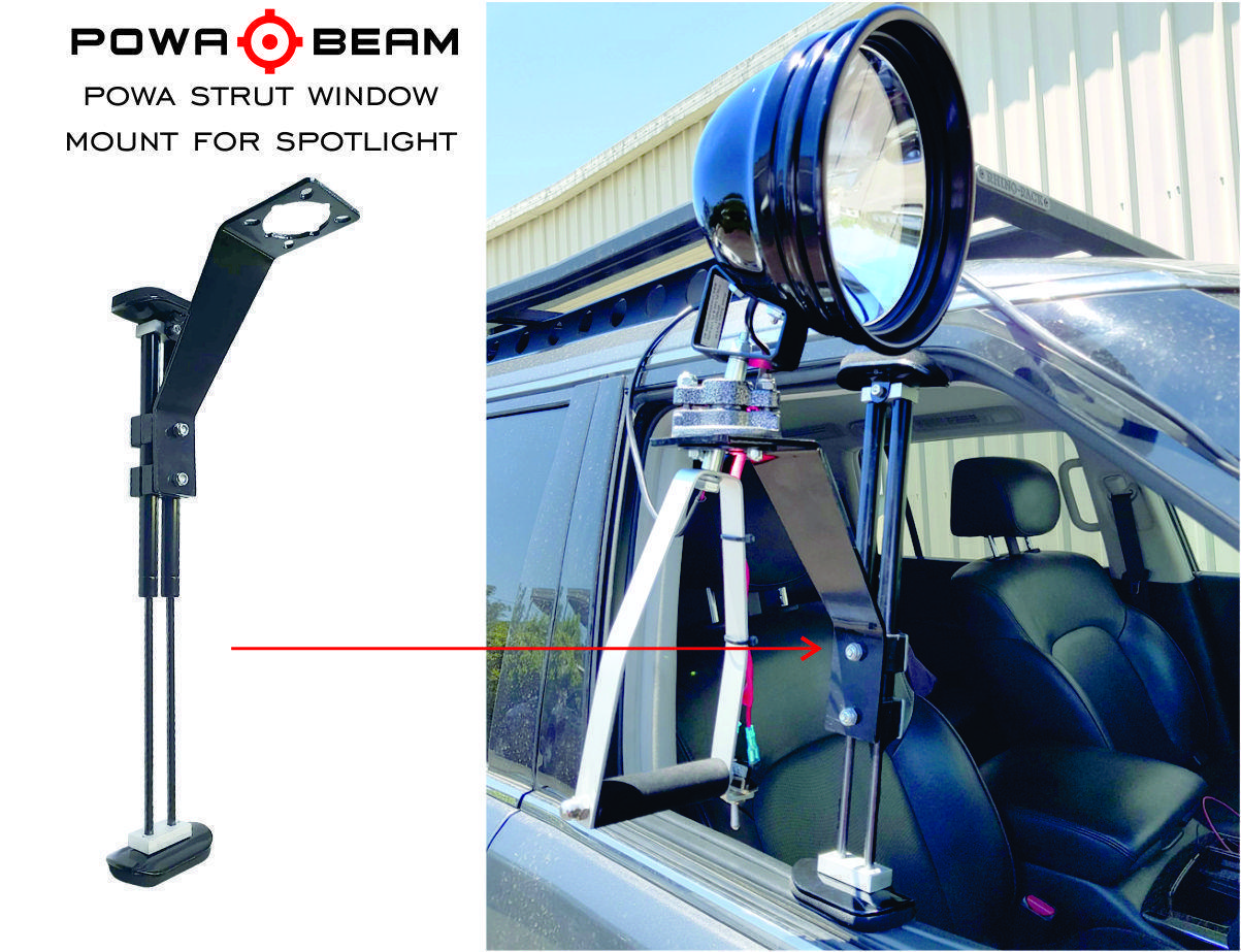 Powa Beam’s new design POWA STRUT Window Mount for Spotlights enables you to fix your spotlight to your door frame without the need to modify your vehicle. Simply push the strut down to compress, line up to the frame and release. It will grab on.