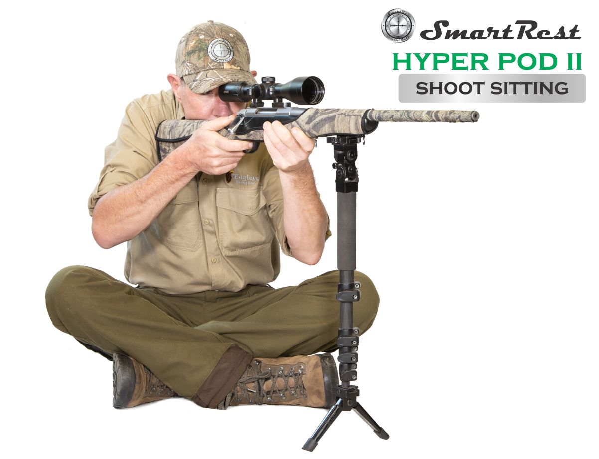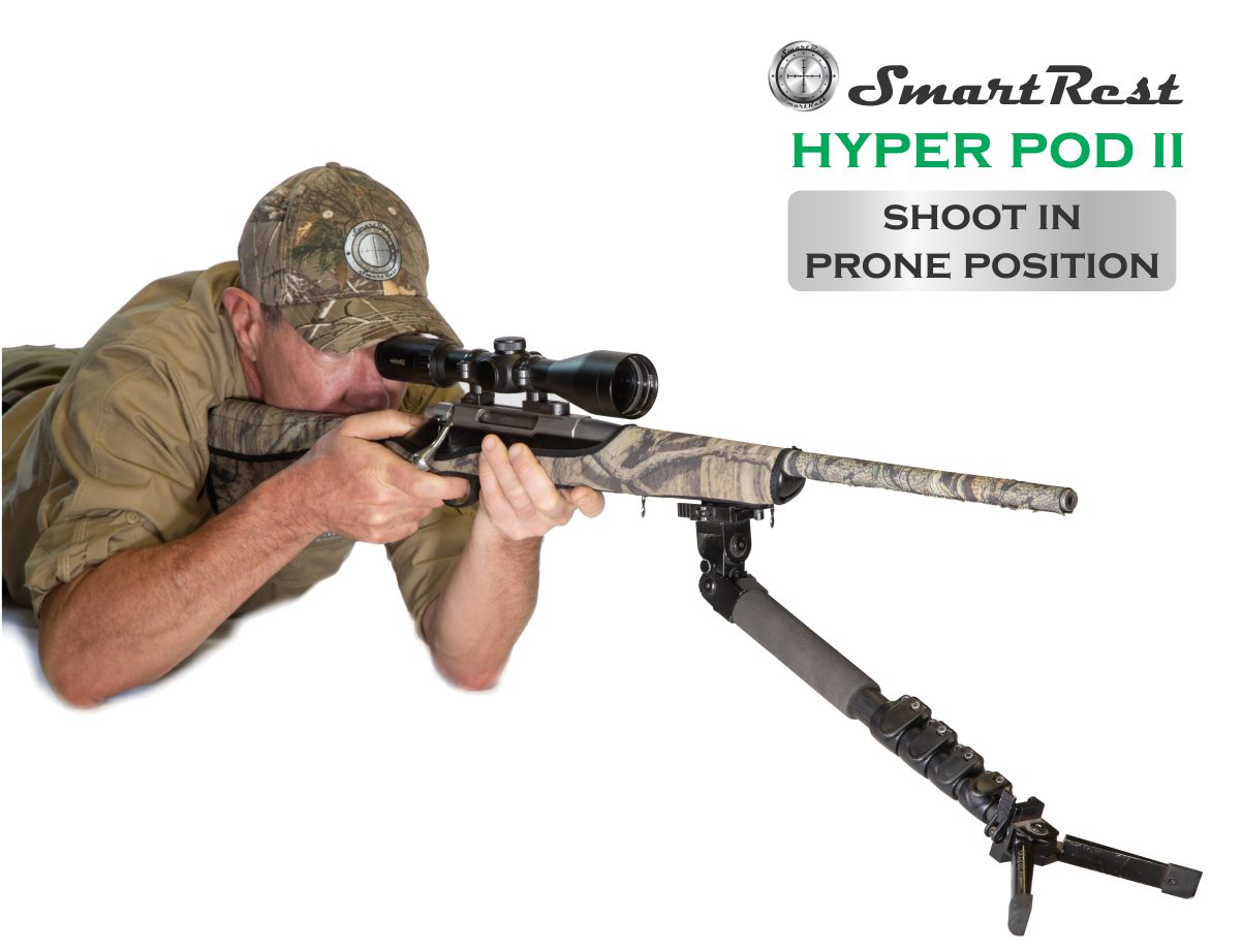 The Hyper Pod II is a carbon fiber extendable pole with a bi pod on the base which was developed to combine the capabilities of the bi pod, mono pod, walking stick and the tripod. The purpose of this design and the combination of the features is to create the most conveniently portable, versatile, and user friendly Hunters/Stalkers gun rest on the market. The Hyper Pod II can aid a shooter in 4 main field hunting positions, which are prone, sitting, kneeling and standing. All positions have their benefits in various terrains. The design features materials that supply weight efficiency, strength and reliability for long term use.
